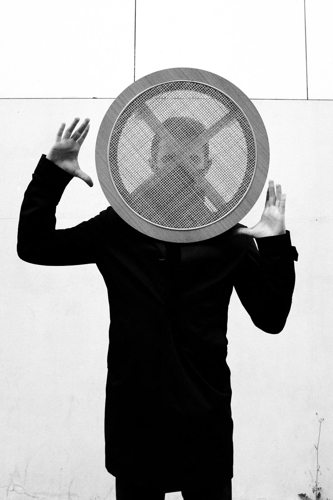 As the black coat contrasted too much with the background, I decided to put my hands on my chest to somehow balance the highlights and shadows. The idea turned out to be very successful, as the unusual hand position together with the even less familiar circle on my head formed a kind of religious image.